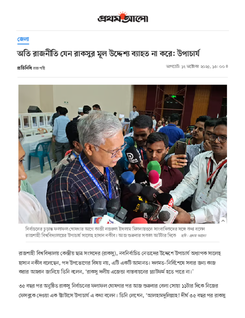 অতি রাজনীতি যেন রাকসুর মূল উদ্দেশ্য ব্যাহত না করে_ উপাচার্য _ প্রথম আলো.pdf Published on 17 October 2025 Newspaper দৈনিক প্রথম আলো Category Personal Opinion / Discussion / Commentary General Education Download