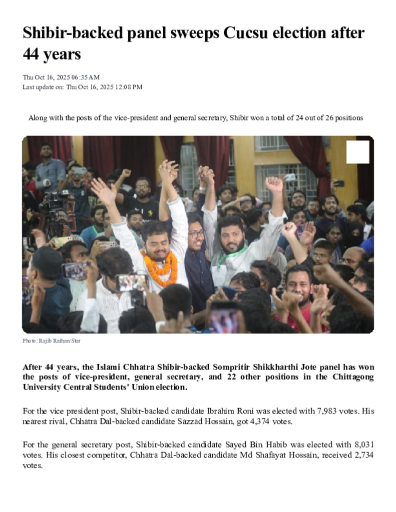 Shibir-backed panel sweeps Cucsu election after 44 years _ The Daily Star.pdf Published on 16 October 2025 Newspaper The Daily Star Category Student Politics General Education Download