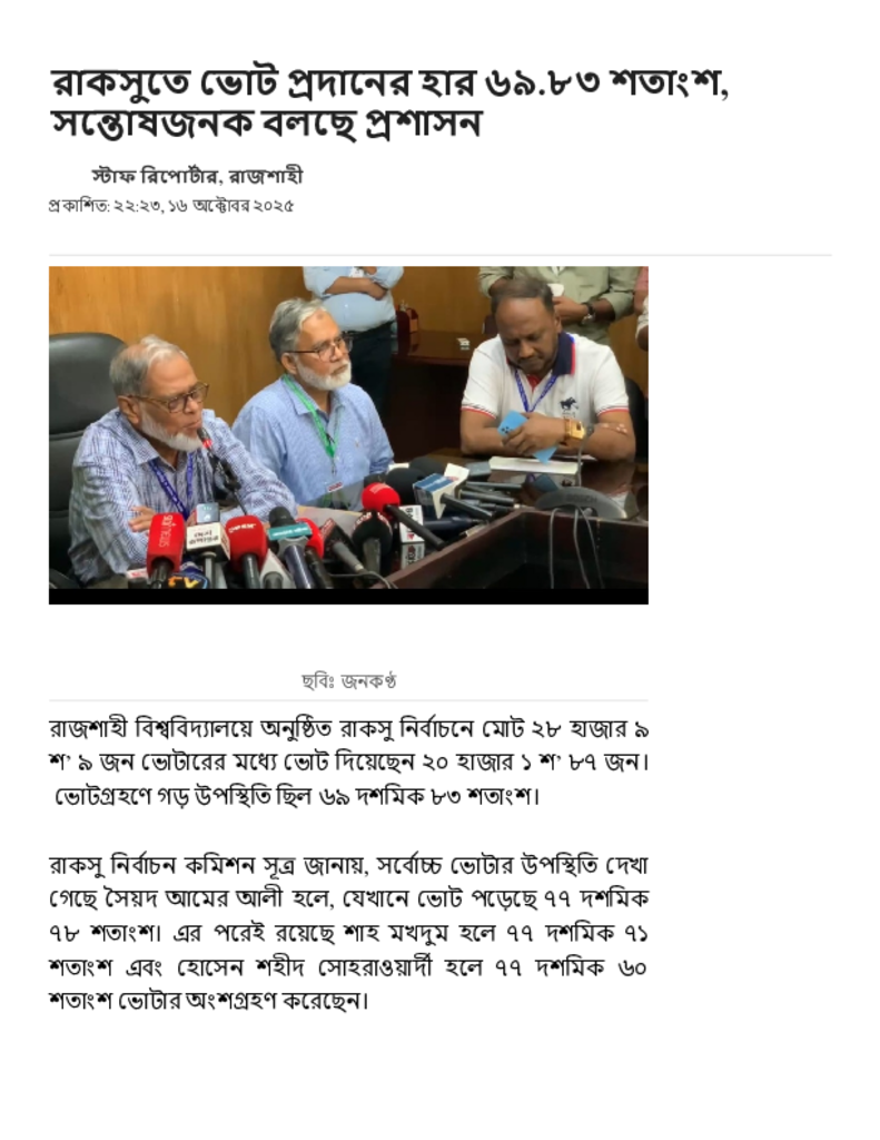 রাকসুতে ভোট প্রদানের হার ৬৯.৮৩ শতাংশ, সন্তোষজনক বলছে প্রশাসন.pdf Published on 16 October 2025 Newspaper দৈনিক জনকণ্ঠ Category Student Politics General Education Download