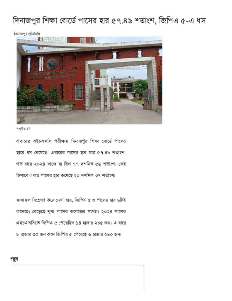 দিনাজপুর শিক্ষা বোর্ডে পাসের হার ৫৭.৪৯ শতাংশ, জিপিএ ৫-এ ধস.pdf Published on 16 October 2025 Newspaper দৈনিক কালের কন্ঠ Category Public Examination Public Examination HSC Download