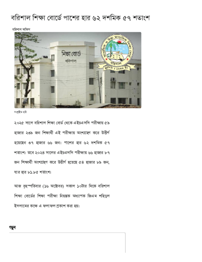 বরিশাল শিক্ষা বোর্ডে পাশের হার ৬২ দশমিক ৫৭ শতাংশ.pdf Published on 16 October 2025 Newspaper দৈনিক কালের কন্ঠ Category Public Examination Public Examination HSC Download