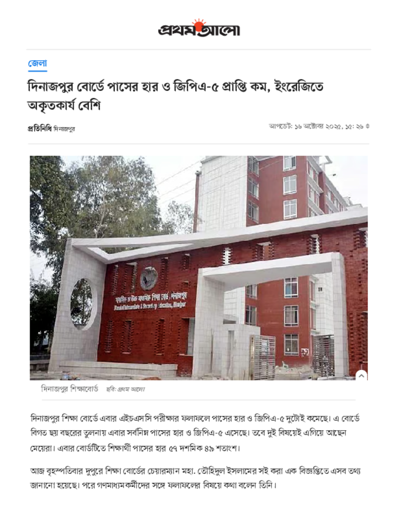 দিনাজপুর বোর্ডে পাসের হার ও জিপিএ-৫ প্রাপ্তি কম, ইংরেজিতে অকৃতকার্য বেশি.pdf Published on 16 October 2025 Newspaper দৈনিক প্রথম আলো Category Public Examination Public Examination HSC Download