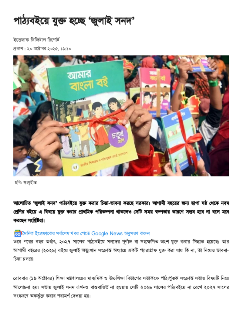পাঠ্যবইয়ে যুক্ত হচ্ছে ‘জুলাই সনদ’.pdf Published on 20 October 2025 Newspaper দৈনিক ইত্তেফাক Category Educational Ministry / Departments Download