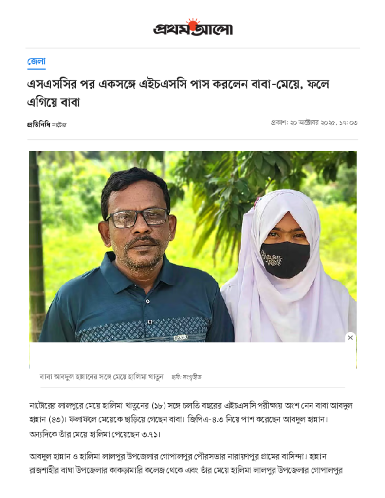 এসএসসির পর একসঙ্গে এইচএসসি পাস করলেন বাবা–মেয়ে, ফলে এগিয়ে বাবা.pdf Published on 20 October 2025 Newspaper দৈনিক প্রথম আলো Category Personal Opinion / Discussion / Commentary Public Examination HSC Download