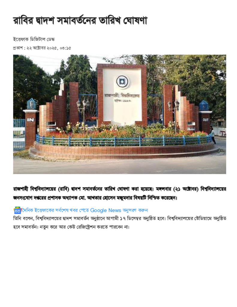 রাবির দ্বাদশ সমাবর্তনের তারিখ ঘোষণা.pdf Published on 22 October 2025 Newspaper দৈনিক ইত্তেফাক Category General Education General Education Download