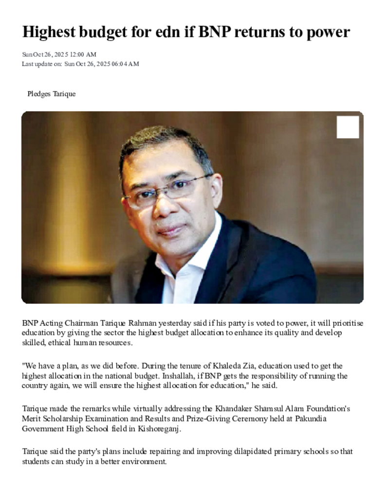 Highest budget for edn if BNP returns to power _ The Daily Star.pdf Published on 26 October 2025 Newspaper The Daily Star Category Personal Opinion / Discussion / Commentary Download