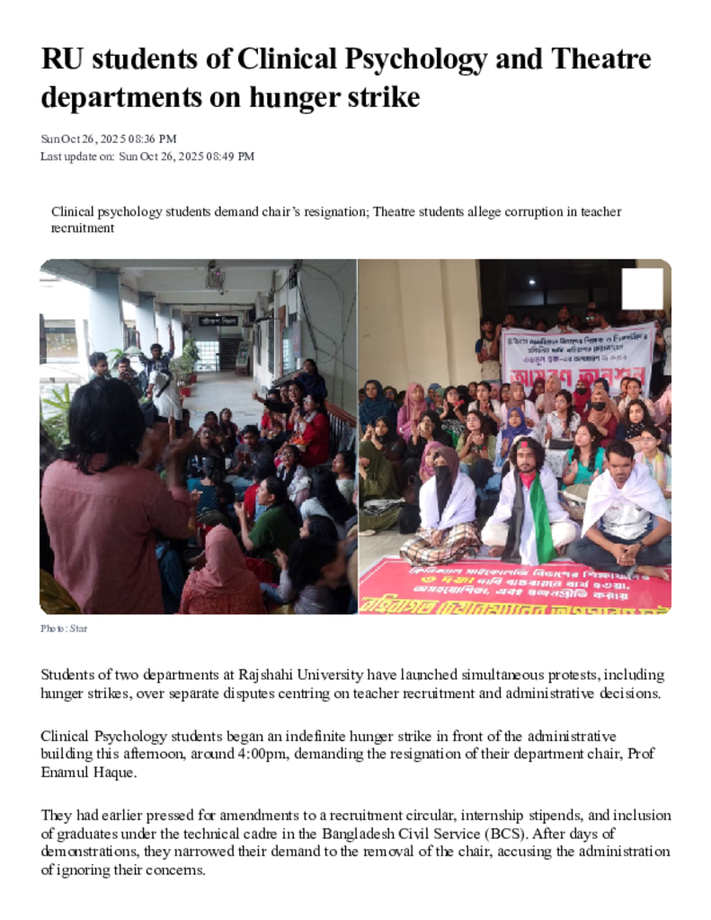RU students of Clinical Psychology and Theatre departments on hunger strike _ The Daily Star.pdf Published on 26 October 2025 Newspaper The Daily Star Category Others General Education Download