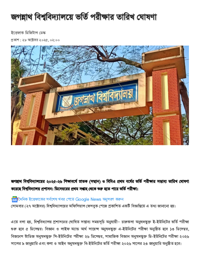 জগন্নাথ বিশ্ববিদ্যালয়ে ভর্তি পরীক্ষার তারিখ ঘোষণা.pdf Published on 28 October 2025 Newspaper দৈনিক ইত্তেফাক Category Admission / Seat Problem General Education Higher Education Public Download