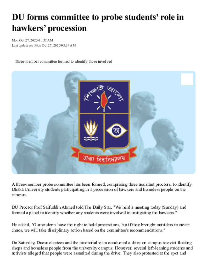 DU forms committee to probe students' role in hawkers’ procession _ The Daily Star.pdf Published on 27 October 2025 Newspaper The Daily Star Category General Education General Education Download