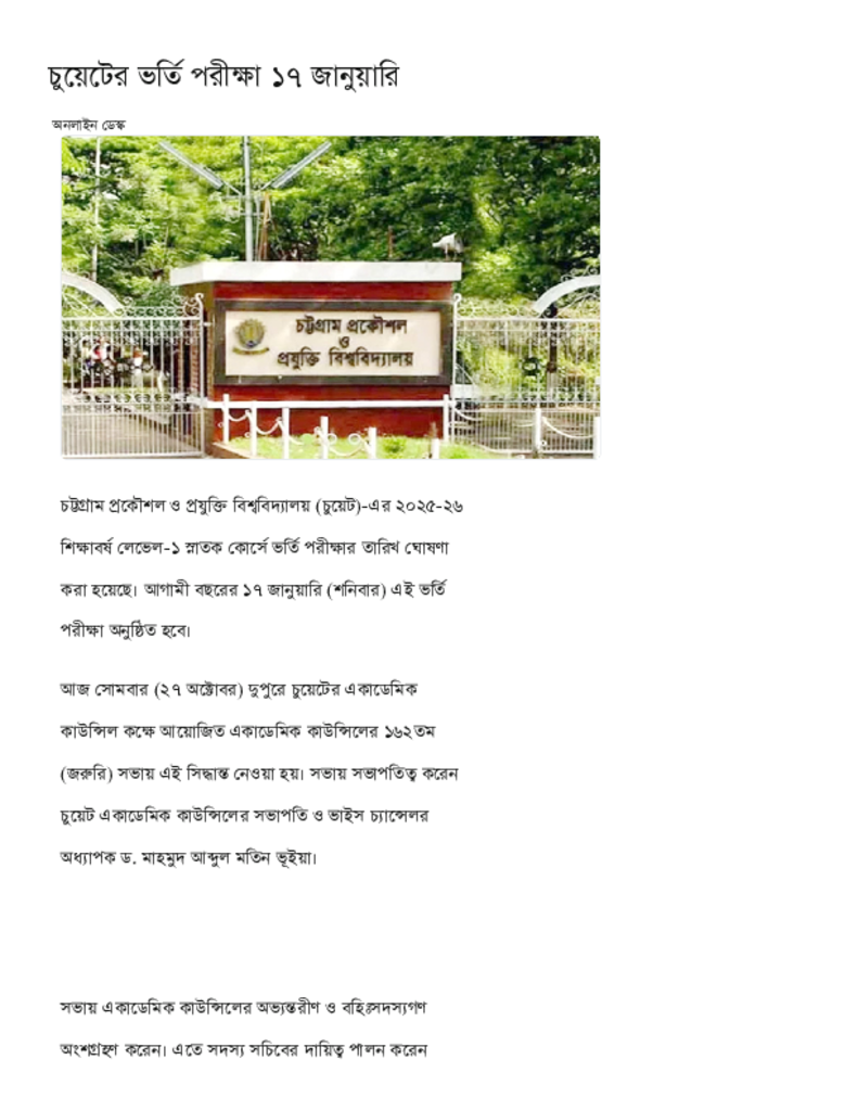 চুয়েটের ভর্তি পরীক্ষা ১৭ জানুয়ারি.pdf Published on 27 October 2025 Newspaper দৈনিক কালের কন্ঠ Category Admission / Seat Problem General Education Professional Education Engineering Download