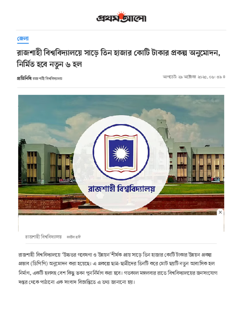 রাজশাহী বিশ্ববিদ্যালয়ে সাড়ে তিন হাজার কোটি টাকার প্রকল্প অনুমোদন, নির্মিত হবে নতুন ৬ হল.pdf Published on 29 October 2025 Newspaper দৈনিক প্রথম আলো Category Educational Ministry / Departments General Education Higher Education Public Download