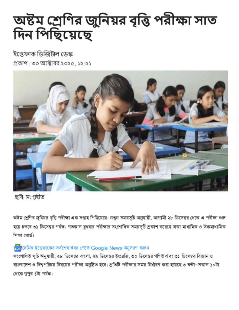 অষ্টম শ্রেণির জুনিয়র বৃত্তি পরীক্ষা সাত দিন পিছিয়েছে.pdf Published on 30 October 2025 Newspaper দৈনিক ইত্তেফাক Category Educational Ministry / Departments Download