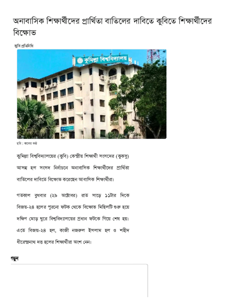 অনাবাসিক শিক্ষার্থীদের প্রার্থিতা বাতিলের দাবিতে কুবিতে শিক্ষার্থীদের বিক্ষোভ.pdf Published on 30 October 2025 Newspaper দৈনিক কালের কন্ঠ Category Student Politics Download
