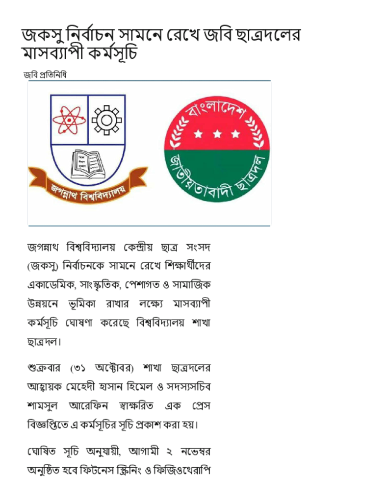 জকসু নির্বাচন সামনে রেখে জবি ছাত্রদলের মাসব্যাপী কর্মসূচি.pdf Published on 31 October 2025 Newspaper দৈনিক কালের কন্ঠ Category Student Politics General Education Download