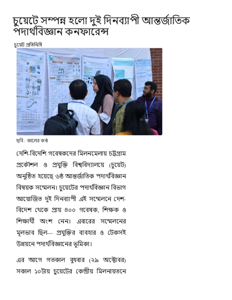 চুয়েটে সম্পন্ন হলো দুই দিনব্যাপী আন্তর্জাতিক পদার্থবিজ্ঞান কনফারেন্স.pdf Published on 30 October 2025 Newspaper দৈনিক কালের কন্ঠ Category Professional Education General Education Professional Education Engineering Download