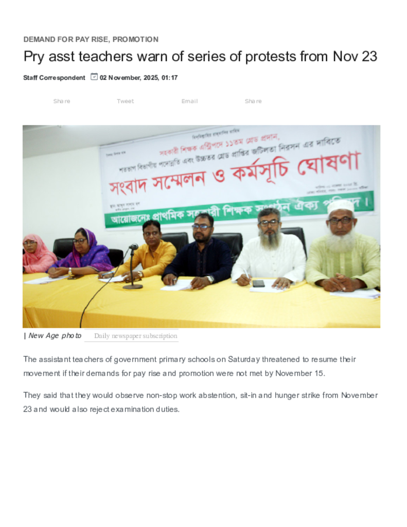 New Age _ Pry asst teachers warn of series of protests from Nov 23.pdf Published on 02 November 2025 Newspaper New Age Category Educational Ministry / Departments Education Ministry / Division / Directorate Download