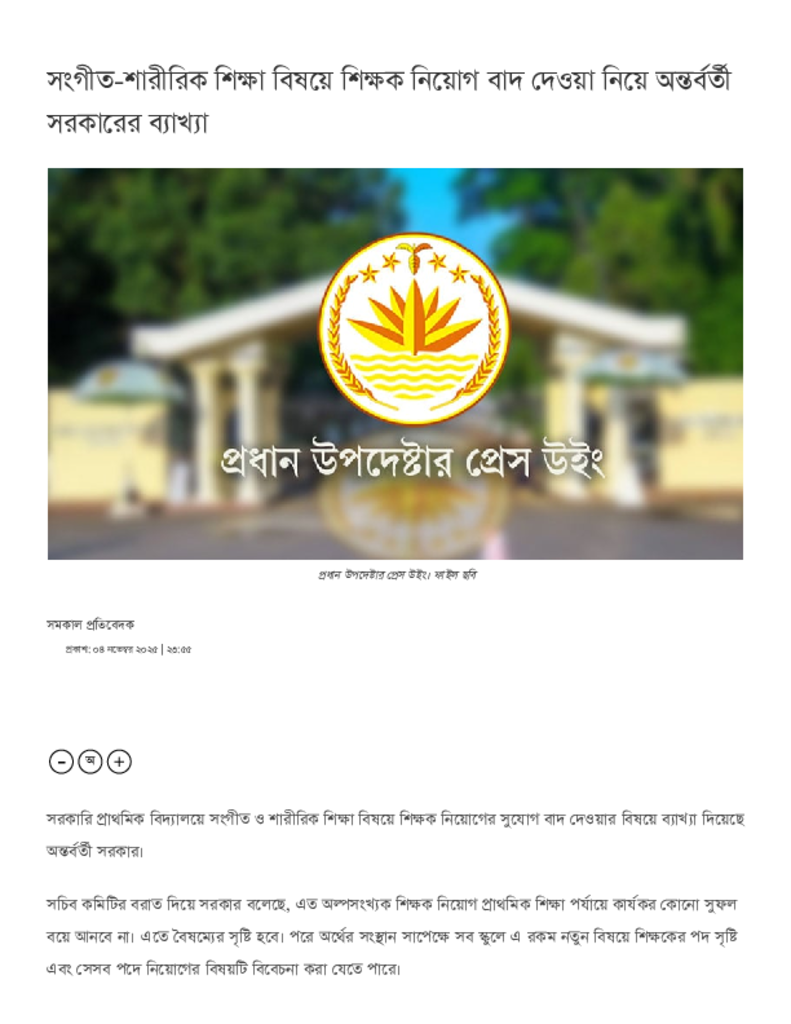 সংগীত-শারীরিক শিক্ষা বিষয়ে শিক্ষক নিয়োগ বাদ দেওয়া নিয়ে অন্তর্বর্তী সরকারের ব্যাখ্যা.pdf Published on 04 November 2025 Newspaper দৈনিক সমকাল Category Educational Ministry / Departments Download