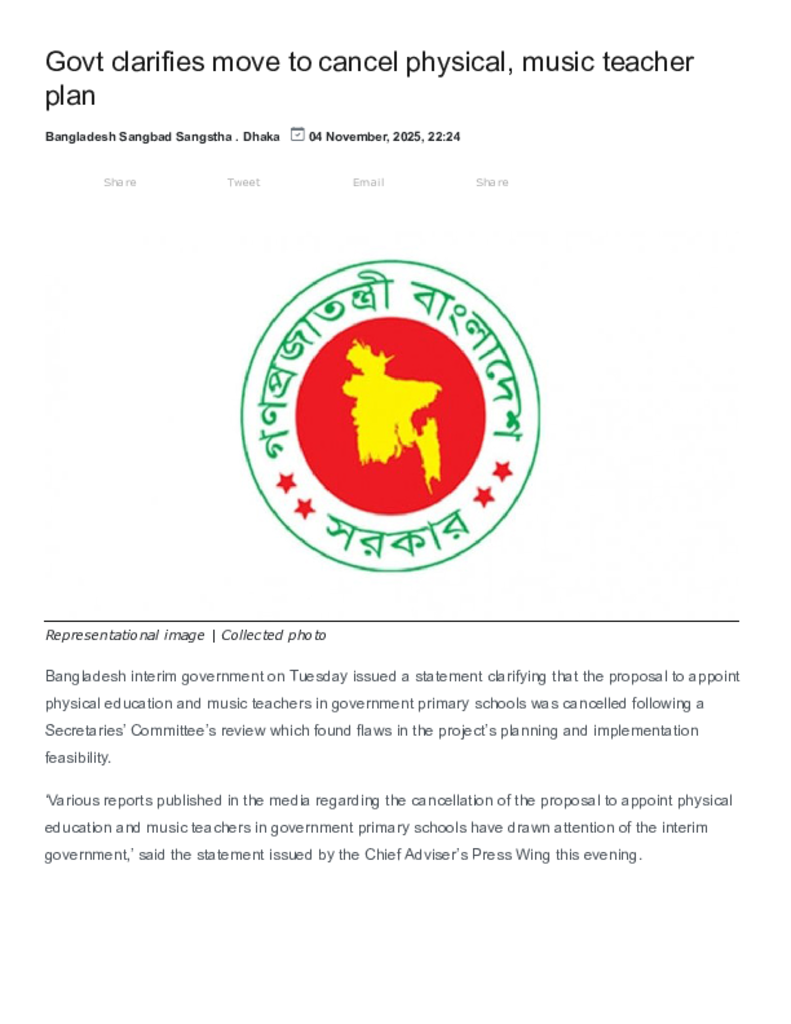 New Age _ Govt clarifies move to cancel physical, music teacher plan.pdf Published on 04 November 2025 Newspaper New Age Category Educational Ministry / Departments Download