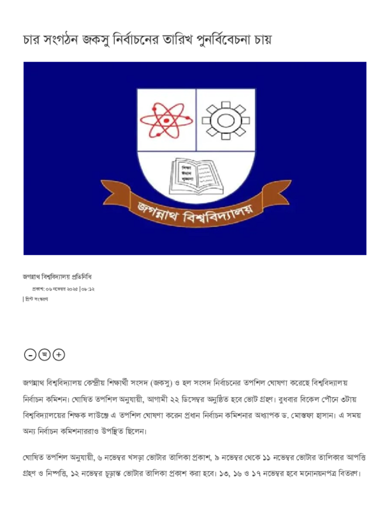 চার সংগঠন জকসু নির্বাচনের তারিখ পুনর্বিবেচনা চায়.pdf Published on 06 November 2025 Newspaper দৈনিক সমকাল Category Student Politics General Education Download