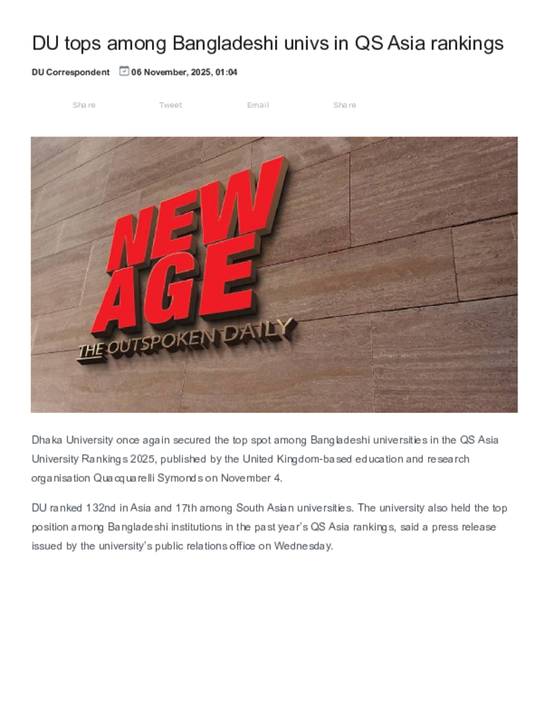 New Age _ DU tops among Bangladeshi univs in QS Asia rankings.pdf Published on 06 November 2025 Newspaper New Age Category Personal Opinion / Discussion / Commentary General Education Download