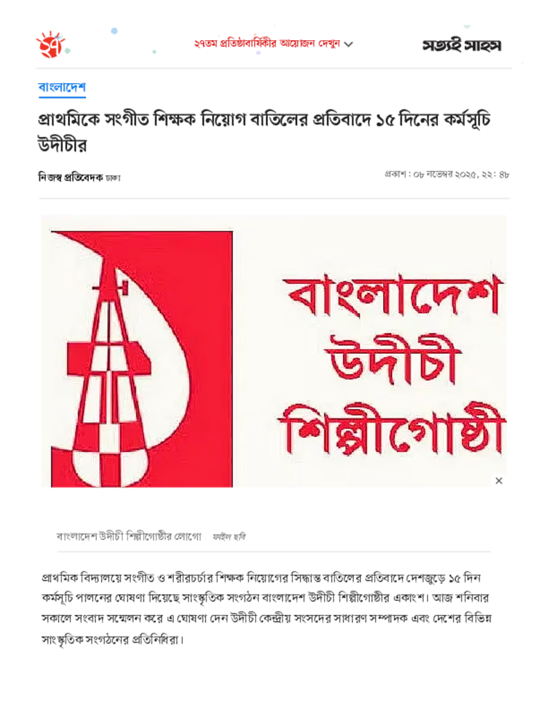 প্রাথমিকে সংগীত শিক্ষক নিয়োগ বাতিলের প্রতিবাদে ১৫ দিনের কর্মসূচি উদীচীর.pdf Published on 08 November 2025 Newspaper দৈনিক প্রথম আলো Category Others General Education Download