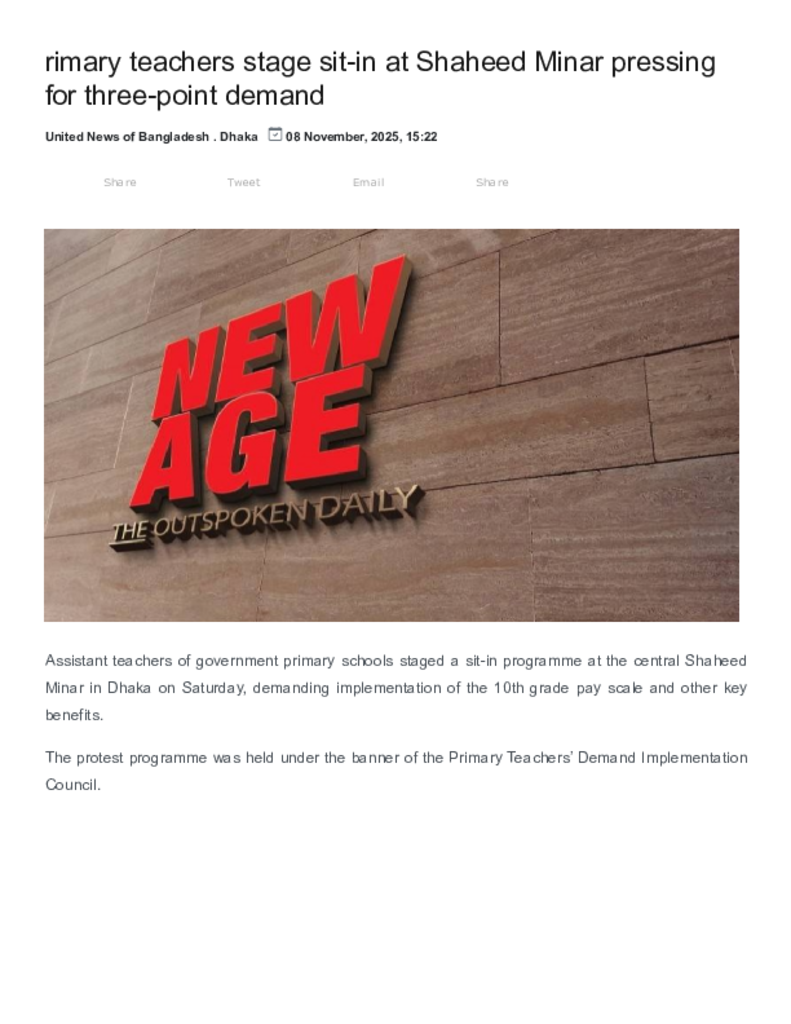 New Age _ Primary teachers stage sit-in at Shaheed Minar pressing for three-point demand.pdf Published on 08 November 2025 Newspaper New Age Category General Education General Education Download
