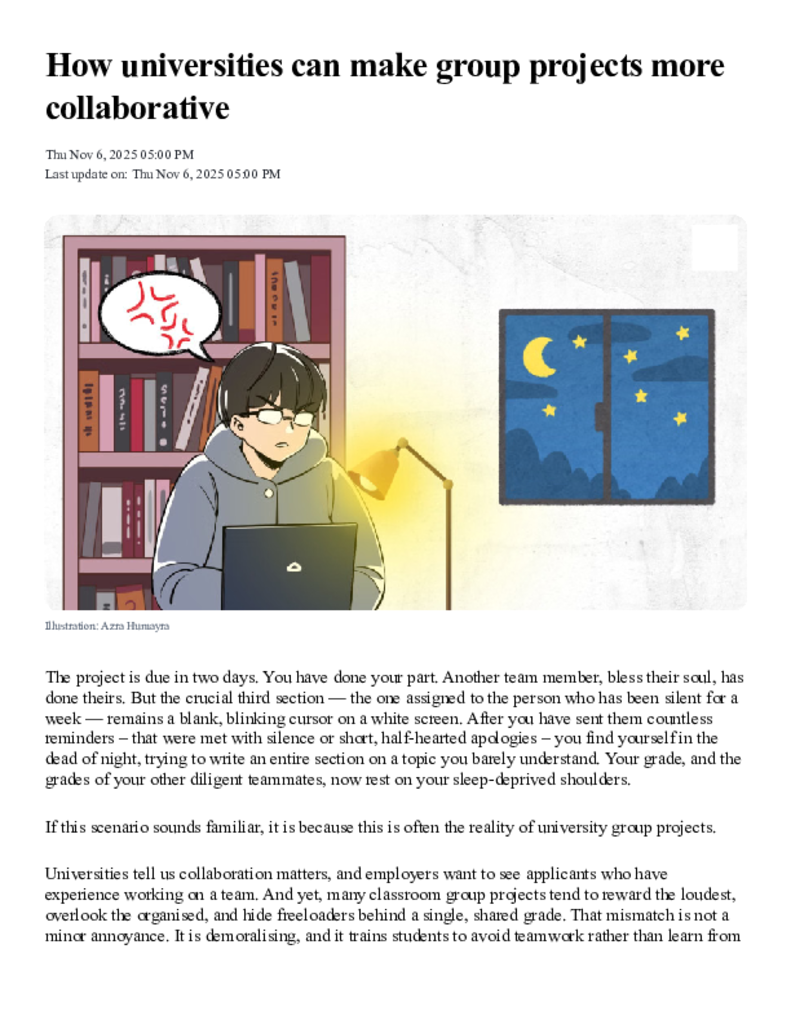 How universities can make group projects more collaborative _ The Daily Star.pdf Published on 06 November 2025 Newspaper The Daily Star Category Personal Opinion / Discussion / Commentary General Education Download