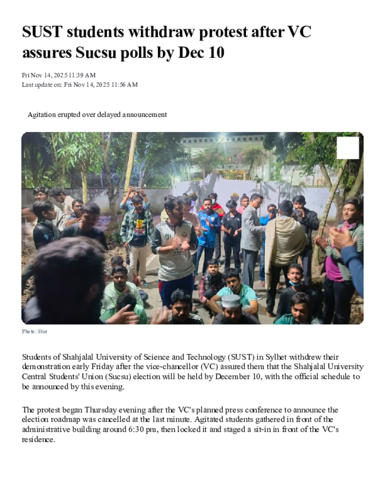 SUST students withdraw protest after VC assures Sucsu polls by Dec 10 _ The Daily Star.pdf Published on 14 November 2025 Newspaper The Daily Star Category Student Politics Download