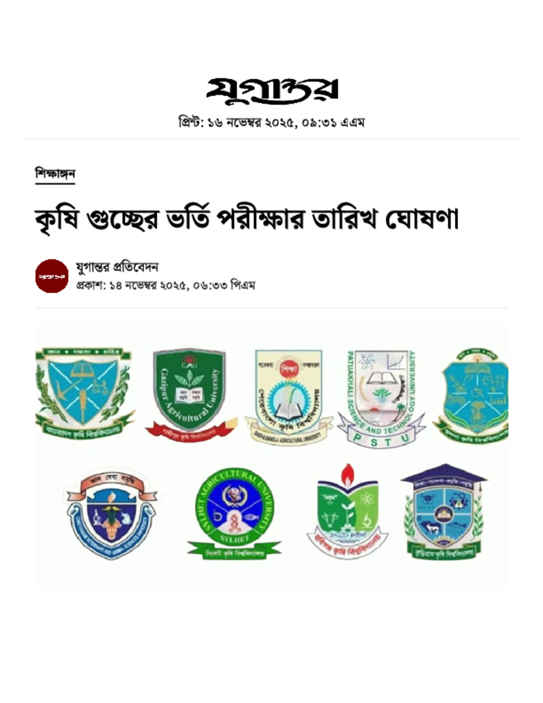 কৃষি গুচ্ছের ভর্তি পরীক্ষার তারিখ ঘোষণা.pdf Published on 14 November 2025 Newspaper দৈনিক যুগান্তর Category Admission / Seat Problem Professional Education Others Download