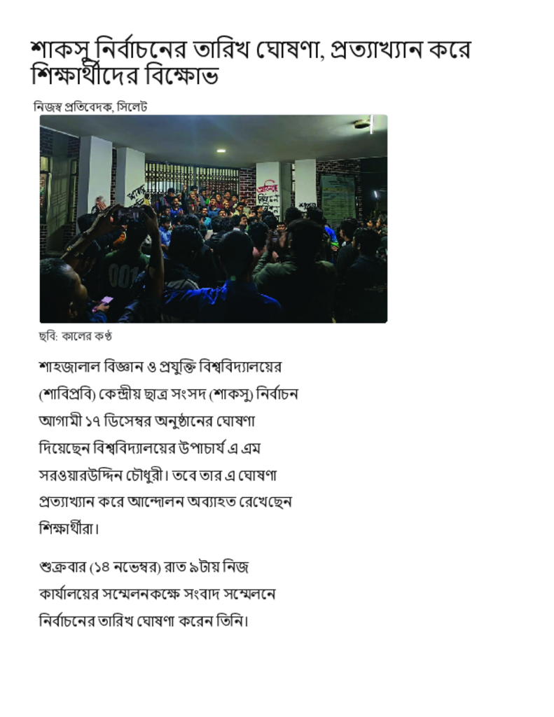 শাকসু নির্বাচনের তারিখ ঘোষণা, প্রত্যাখ্যান করে শিক্ষার্থীদের বিক্ষোভ.pdf Published on 15 November 2025 Newspaper দৈনিক কালের কন্ঠ Category Student Politics General Education Download
