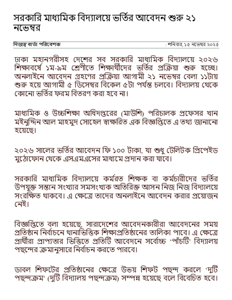 সরকারি মাধ্যমিক বিদ্যালয়ে ভর্তির আবেদন শুরু ২১ নভেম্বর _ সংবাদ অনলাইন.pdf