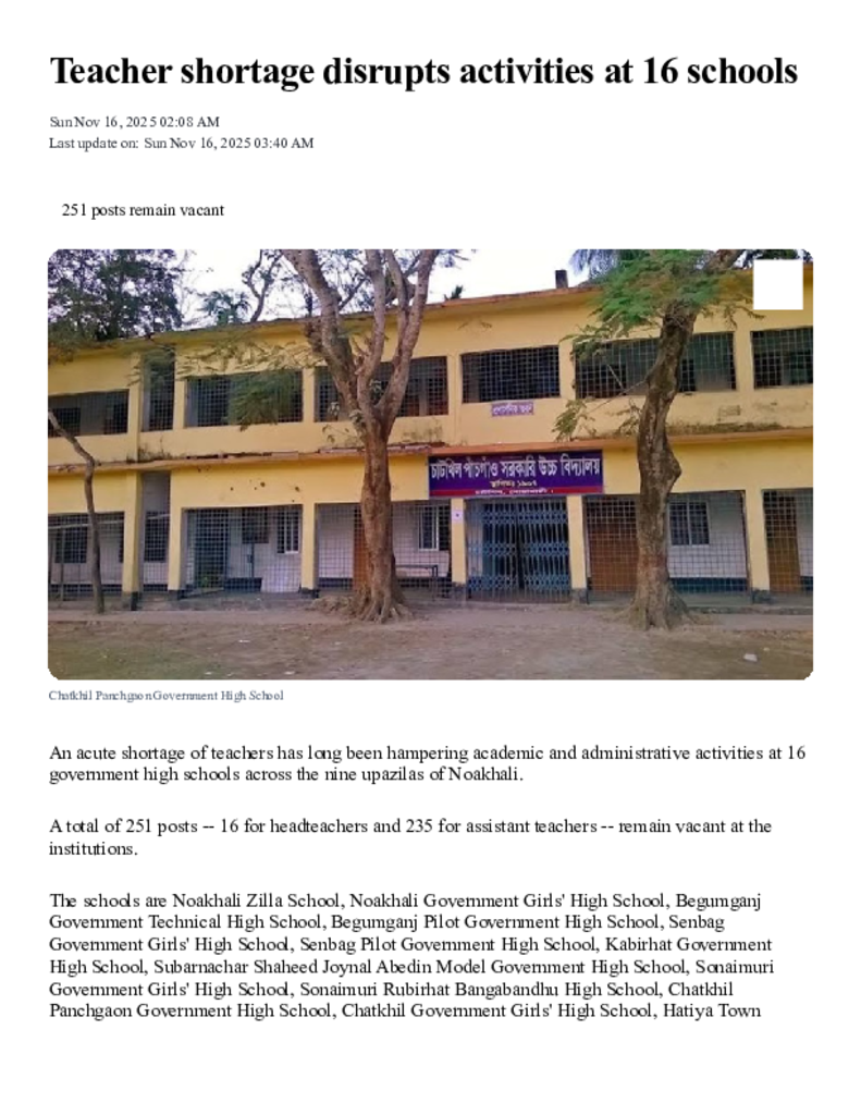 Teacher shortage disrupts activities at 16 schools _ The Daily Star.pdf Published on 16 November 2025 Newspaper The Daily Star Category Personal Opinion / Discussion / Commentary Download