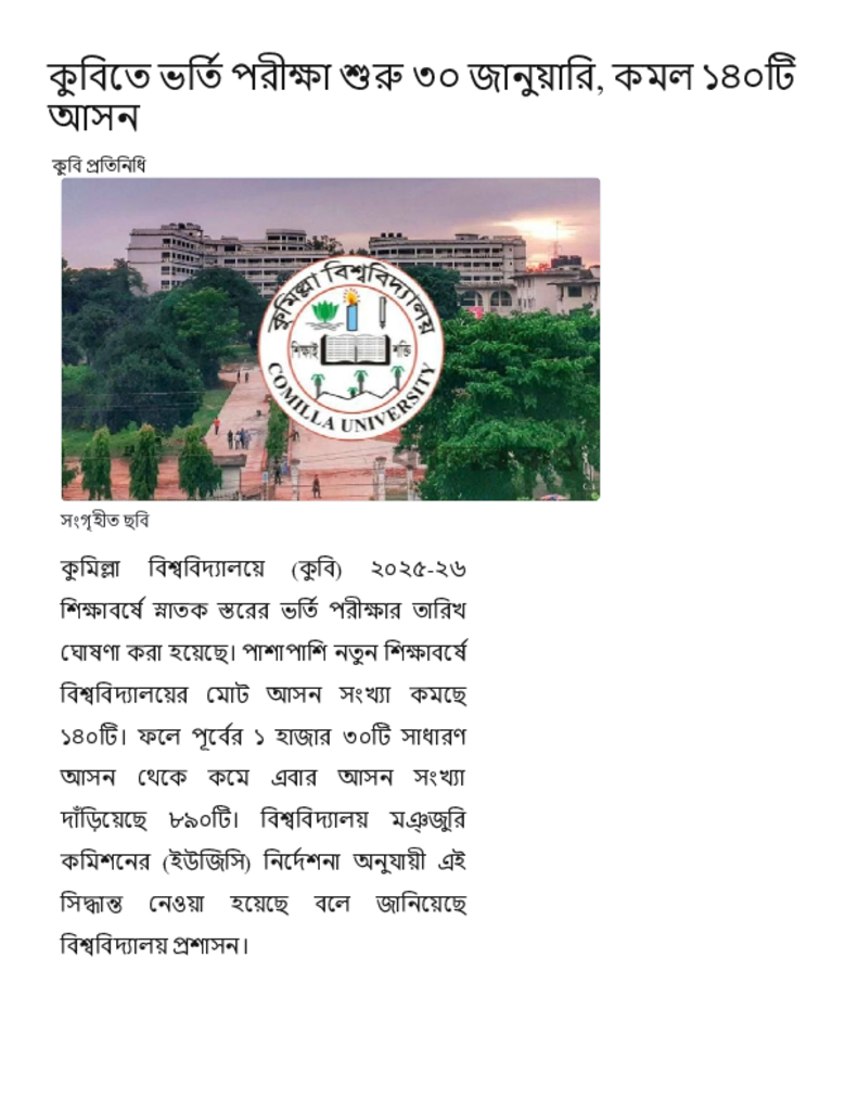 কুবিতে ভর্তি পরীক্ষা শুরু ৩০ জানুয়ারি, কমল ১৪০টি আসন.pdf Published on 16 November 2025 Newspaper দৈনিক কালের কন্ঠ Category Admission / Seat Problem General Education Download
