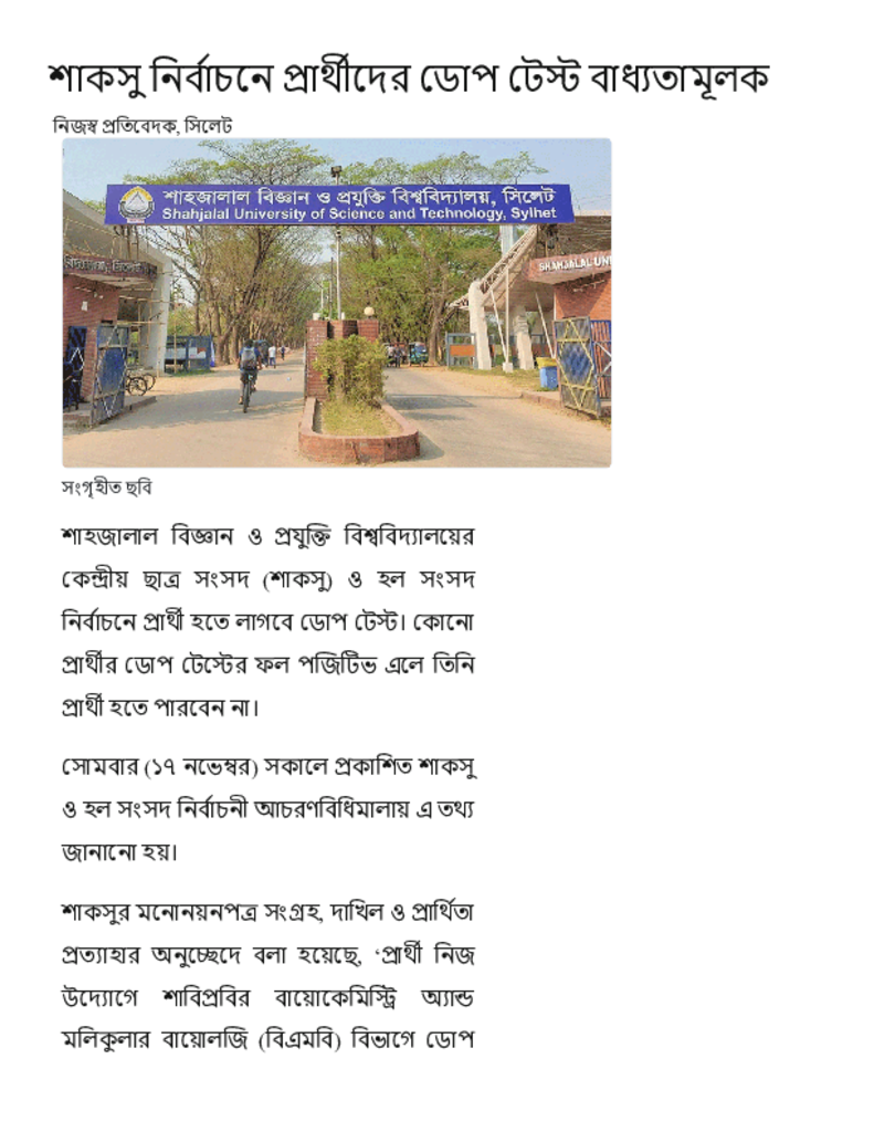 শাকসু নির্বাচনে প্রার্থীদের ডোপ টেস্ট বাধ্যতামূলক.pdf Published on 17 November 2025 Newspaper দৈনিক কালের কন্ঠ Category Student Politics General Education Download