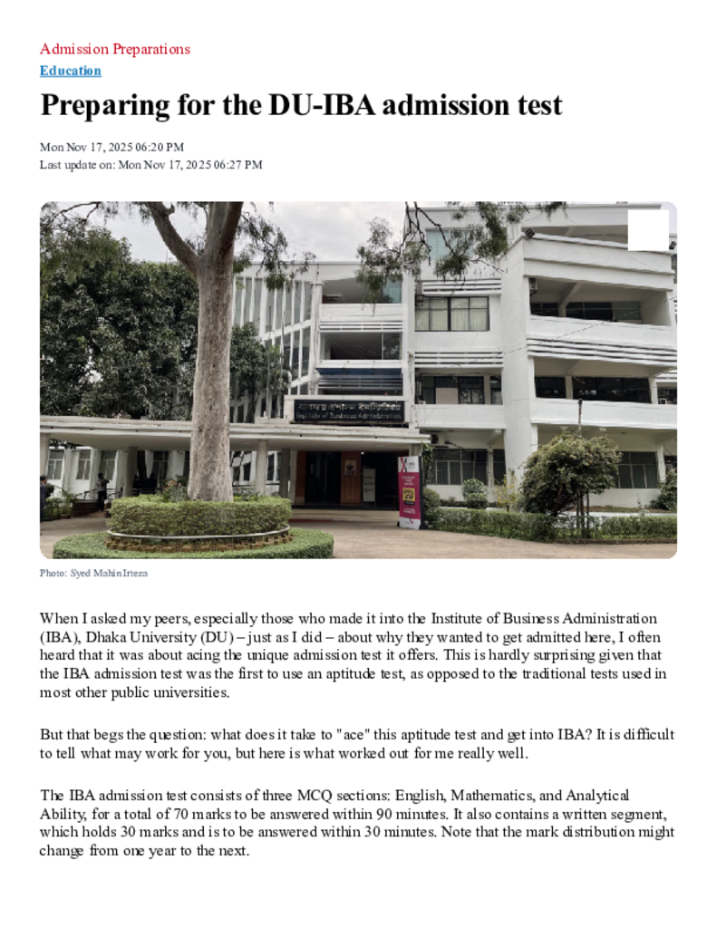 Preparing for the DU-IBA admission test _ The Daily Star.pdf Published on 17 November 2025 Newspaper The Daily Star Category Admission / Seat Problem General Education Download