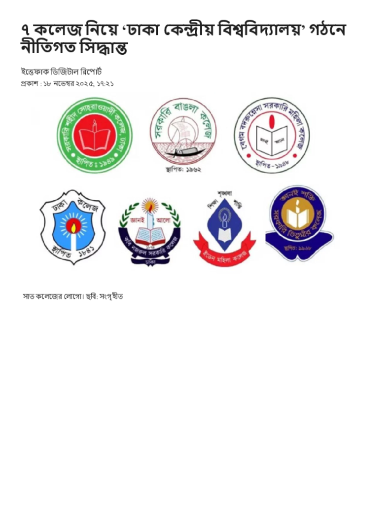 ৭ কলেজ নিয়ে ‘ঢাকা কেন্দ্রীয় বিশ্ববিদ্যালয়’ গঠনে নীতিগত সিদ্ধান্ত.pdf Published on 18 November 2025 Newspaper দৈনিক ইত্তেফাক Category Educational Ministry / Departments General Education Download