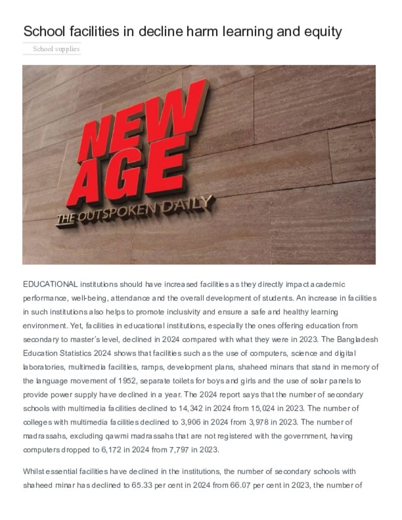 New Age _ School facilities in decline harm learning and equity.pdf Published on 17 November 2025 Newspaper New Age Category Personal Opinion / Discussion / Commentary Download