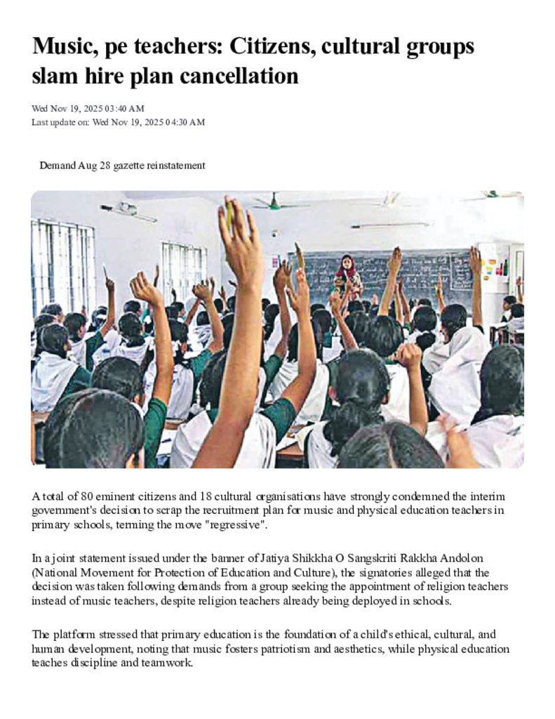 Music, pe teachers_ Citizens, cultural groups slam hire plan cancellation _ The Daily Star.pdf Published on 19 November 2025 Newspaper The Daily Star Category Personal Opinion / Discussion / Commentary General Education Download