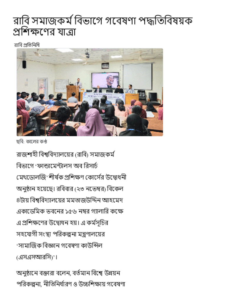 রাবি সমাজকর্ম বিভাগে গবেষণা পদ্ধতিবিষয়ক প্রশিক্ষণের যাত্রা.pdf Published on 24 November 2025 Newspaper দৈনিক কালের কন্ঠ Category General Education General Education Download