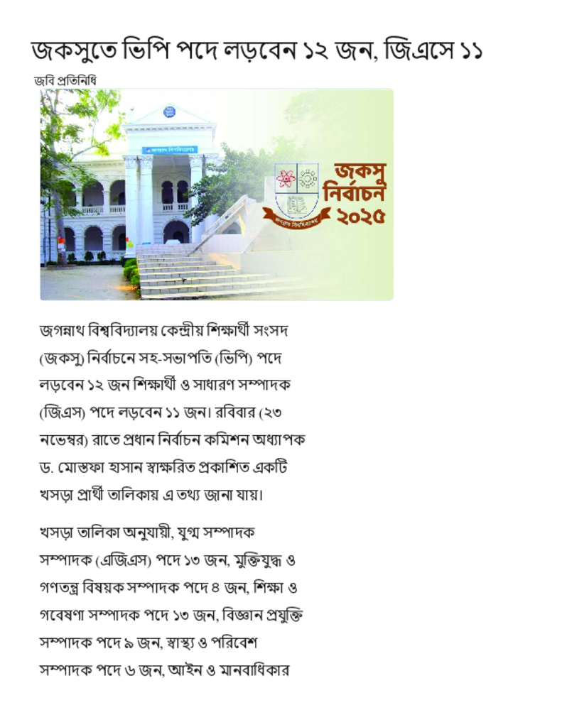জকসুতে ভিপি পদে লড়বেন ১২ জন, জিএসে ১১.pdf Published on 24 November 2025 Newspaper দৈনিক কালের কন্ঠ Category Student Politics General Education Download
