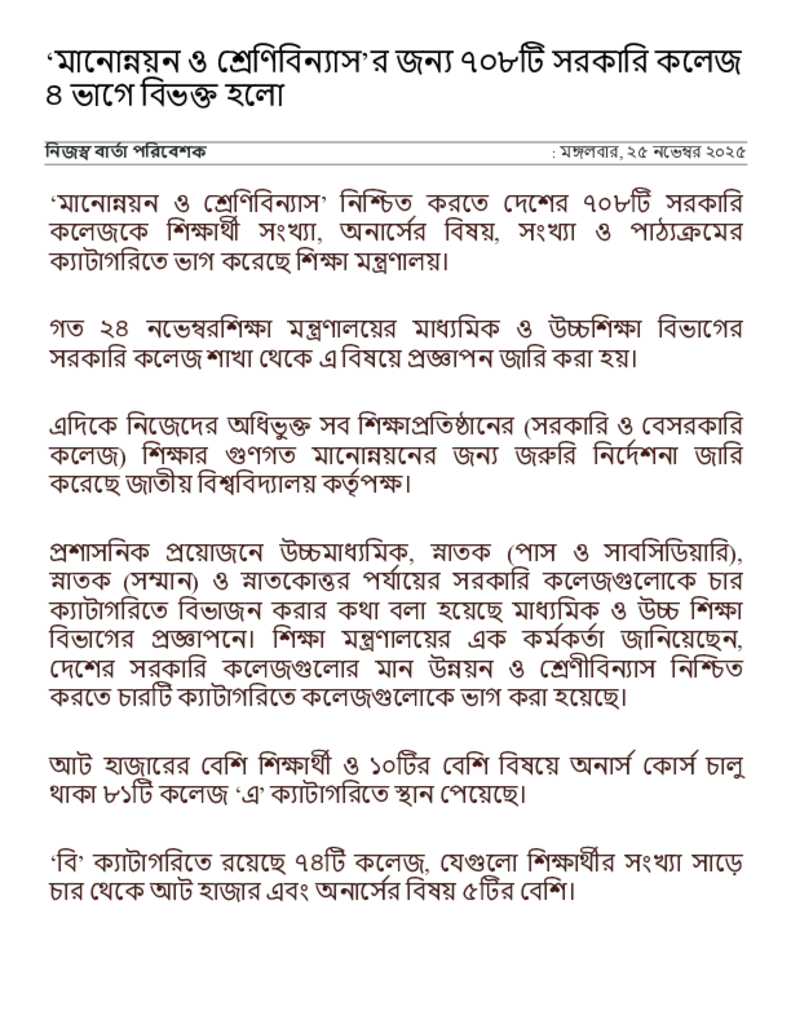 ‘মানোন্নয়ন ও শ্রেণিবিন্যাস’র জন্য ৭০৮টি সরকারি কলেজ ৪ ভাগে বিভক্ত হলো _ সংবাদ অনলাইন.pdf Published on 25 November 2025 Newspaper দৈনিক সংবাদ Category Educational Ministry / Departments General Education Download