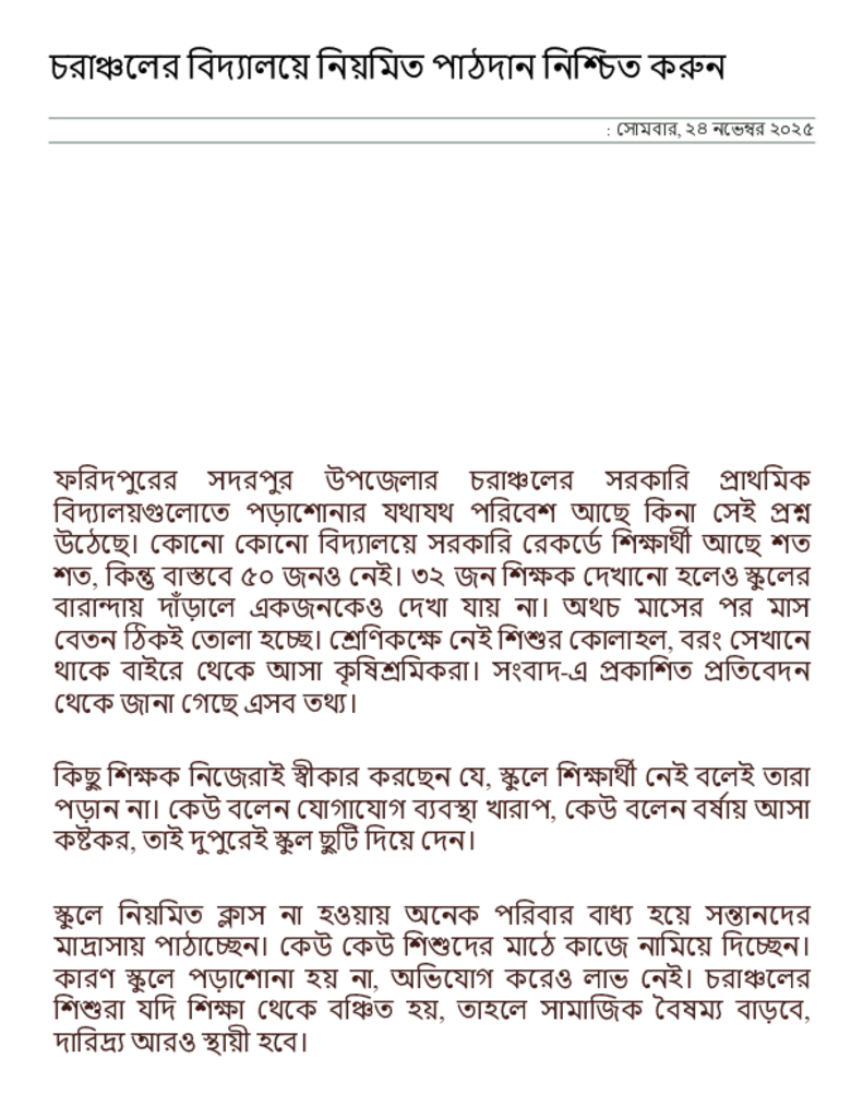 চরাঞ্চলের বিদ্যালয়ে নিয়মিত পাঠদান নিশ্চিত করুন _ সংবাদ অনলাইন.pdf Published on 24 November 2025 Newspaper দৈনিক সংবাদ Category Personal Opinion / Discussion / Commentary Download