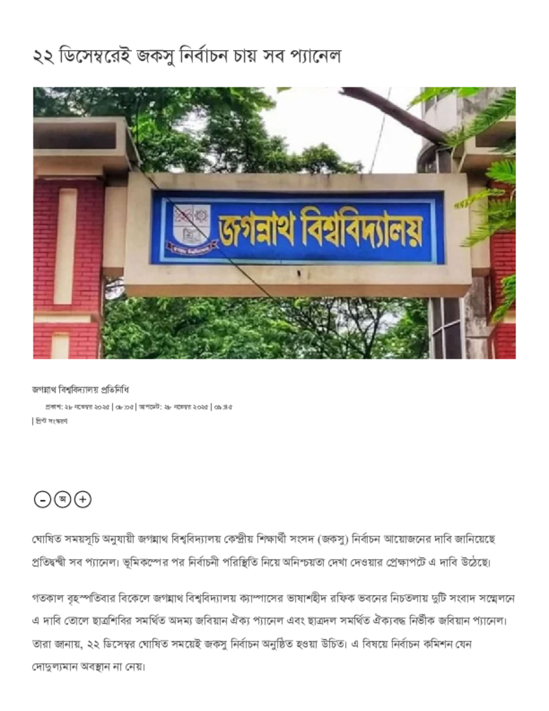 ২২ ডিসেম্বরেই জকসু নির্বাচন চায় সব প্যানেল.pdf Published on 28 November 2025 Newspaper দৈনিক সমকাল Category Student Politics General Education Download
