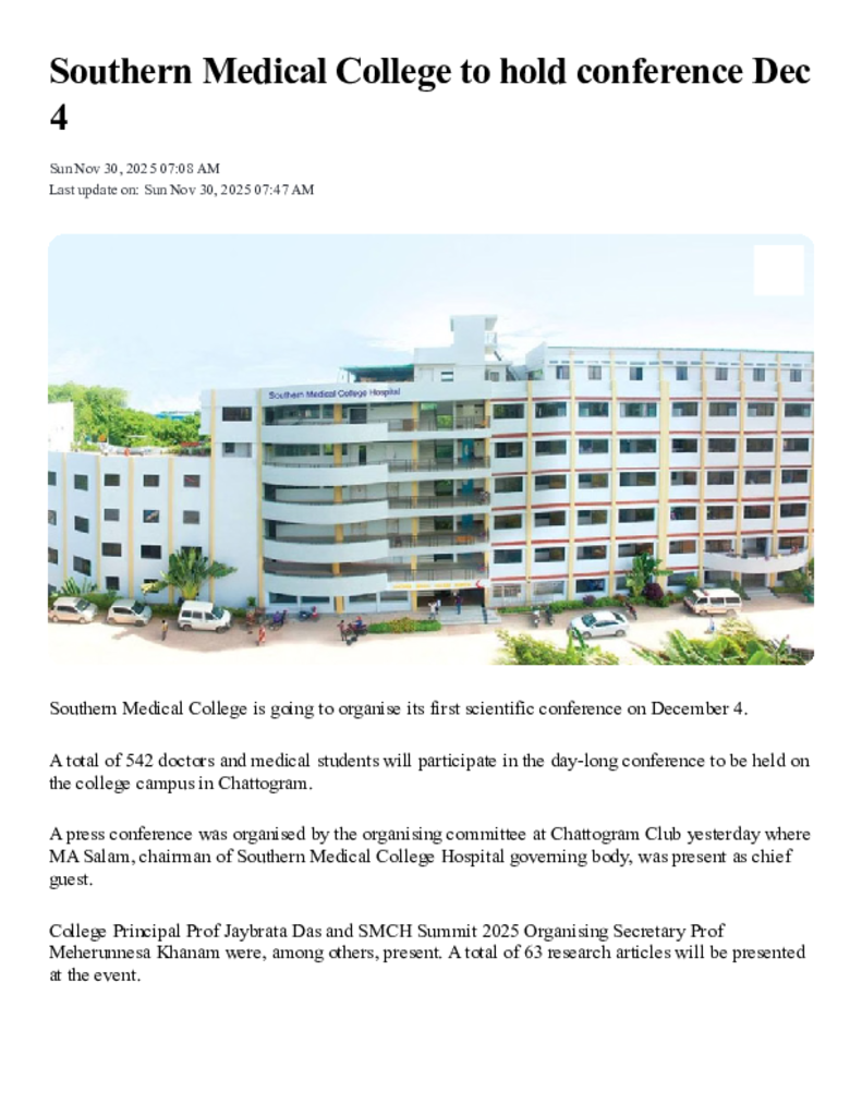 Southern Medical College to hold conference Dec 4 _ The Daily Star.pdf Published on 30 November 2025 Newspaper The Daily Star Category Professional Education Download