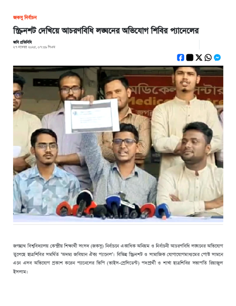 স্ক্রিনশট দেখিয়ে আচরণবিধি লঙ্ঘনের অভিযোগ শিবির প্যানেলের.pdf Published on 27 November 2025 Newspaper দৈনিক আমাদের সময় Category Student Politics Download