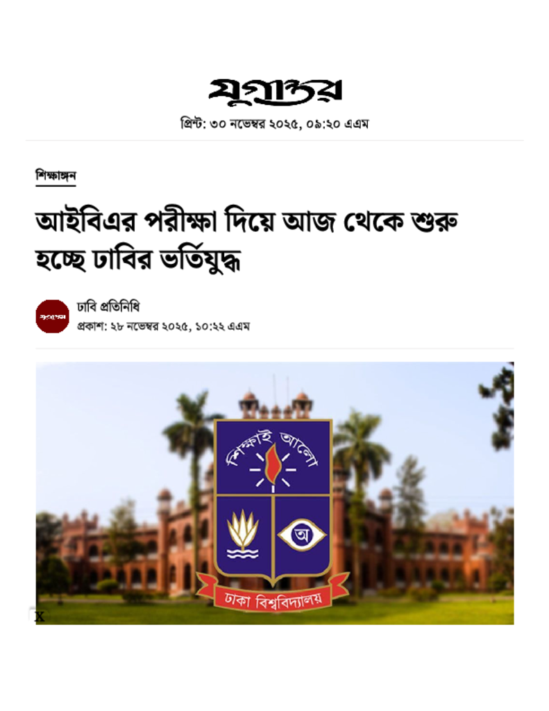 আইবিএর পরীক্ষা দিয়ে আজ থেকে শুরু হচ্ছে ঢাবির ভর্তিযুদ্ধ.pdf Published on 28 November 2025 Newspaper দৈনিক যুগান্তর Category Admission / Seat Problem General Education Download