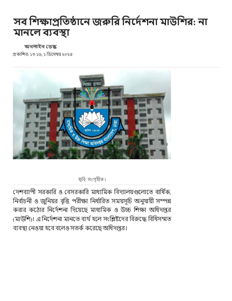 সব শিক্ষাপ্রতিষ্ঠানে জরুরি নির্দেশনা মাউশির_ না মানলে ব্যবস্থা.pdf Published on 01 December 2025 Newspaper দৈনিক জনকণ্ঠ Category Educational Ministry / Departments Download