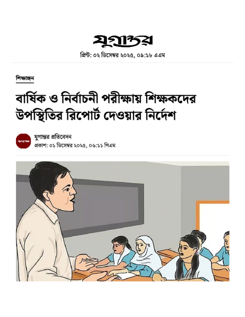 বার্ষিক ও নির্বাচনী পরীক্ষায় শিক্ষকদের উপস্থিতির রিপোর্ট দেওয়ার নির্দেশ.pdf Published on 01 December 2025 Newspaper দৈনিক যুগান্তর Category Educational Ministry / Departments Download