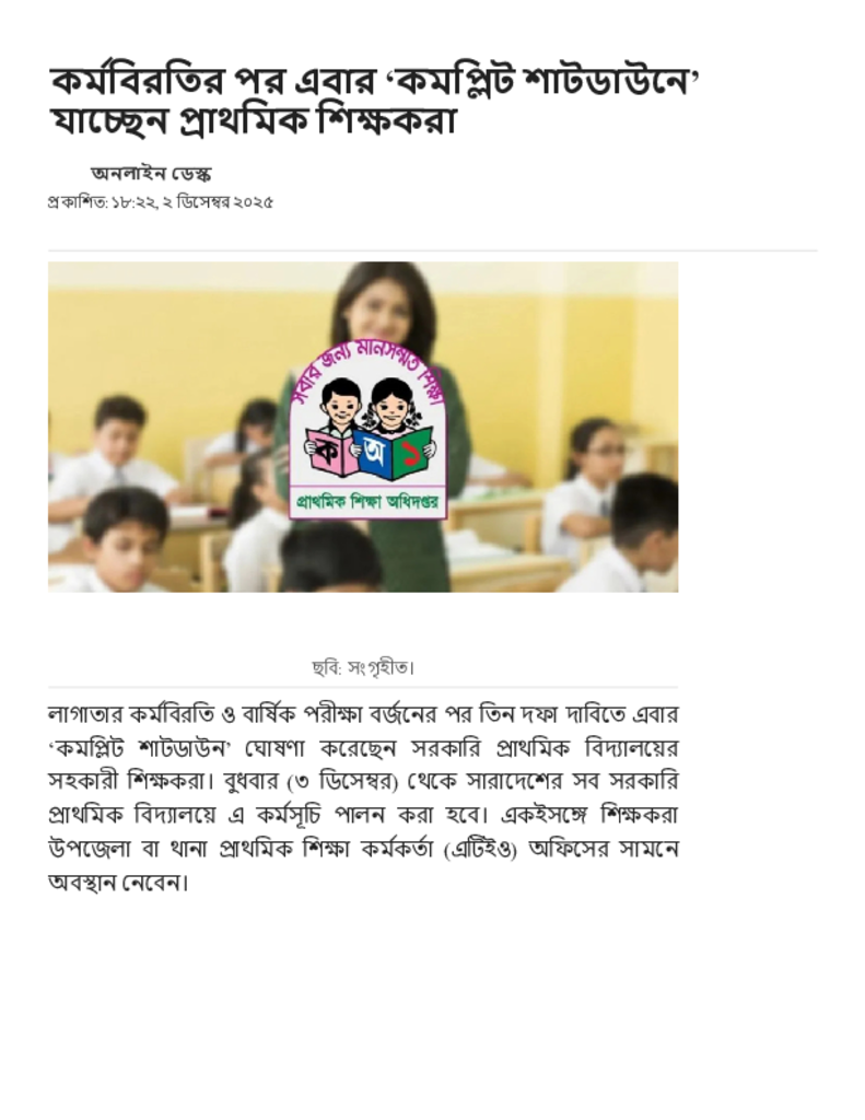 কর্মবিরতির পর এবার ‘কমপ্লিট শাটডাউনে’ যাচ্ছেন প্রাথমিক শিক্ষকরা.pdf Published on 02 December 2025 Newspaper দৈনিক জনকণ্ঠ Category General Education General Education Download