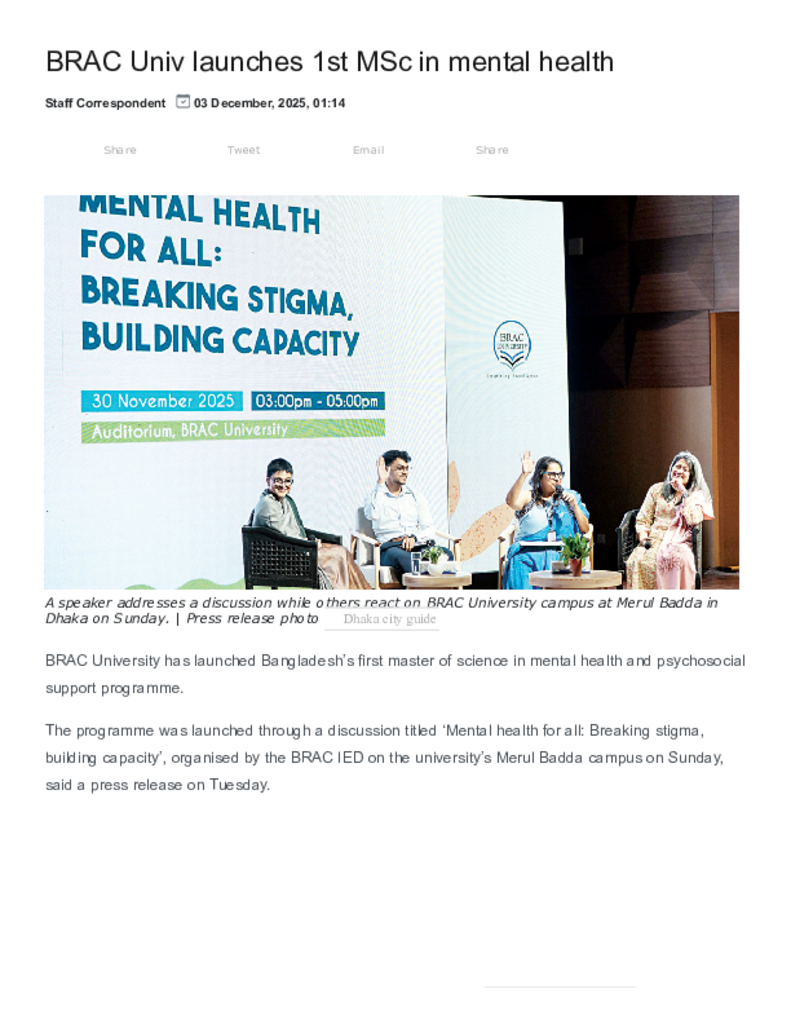 New Age _ BRAC Univ launches 1st MSc in mental health.pdf Published on 03 December 2025 Newspaper New Age Category General Education General Education Higher Education Private Download